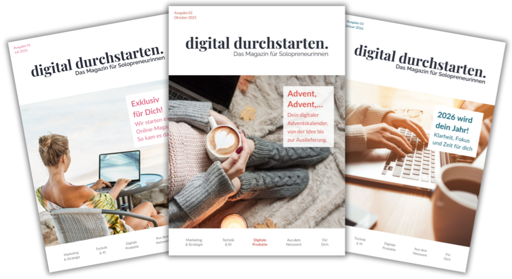 Dein Name ist freiwillig und dient ausschließlich der Personalisierung. Das Magazin erscheint quartalsweise, zusätzlich abonnierst du meinen regulären Newsletter. Du kannst dich jederzeit wieder abmelden, auch von einzelnen Mails. Mehr Informationen, wofür deine Daten verwendet werden, findest du in der Datenschutzerklärung.